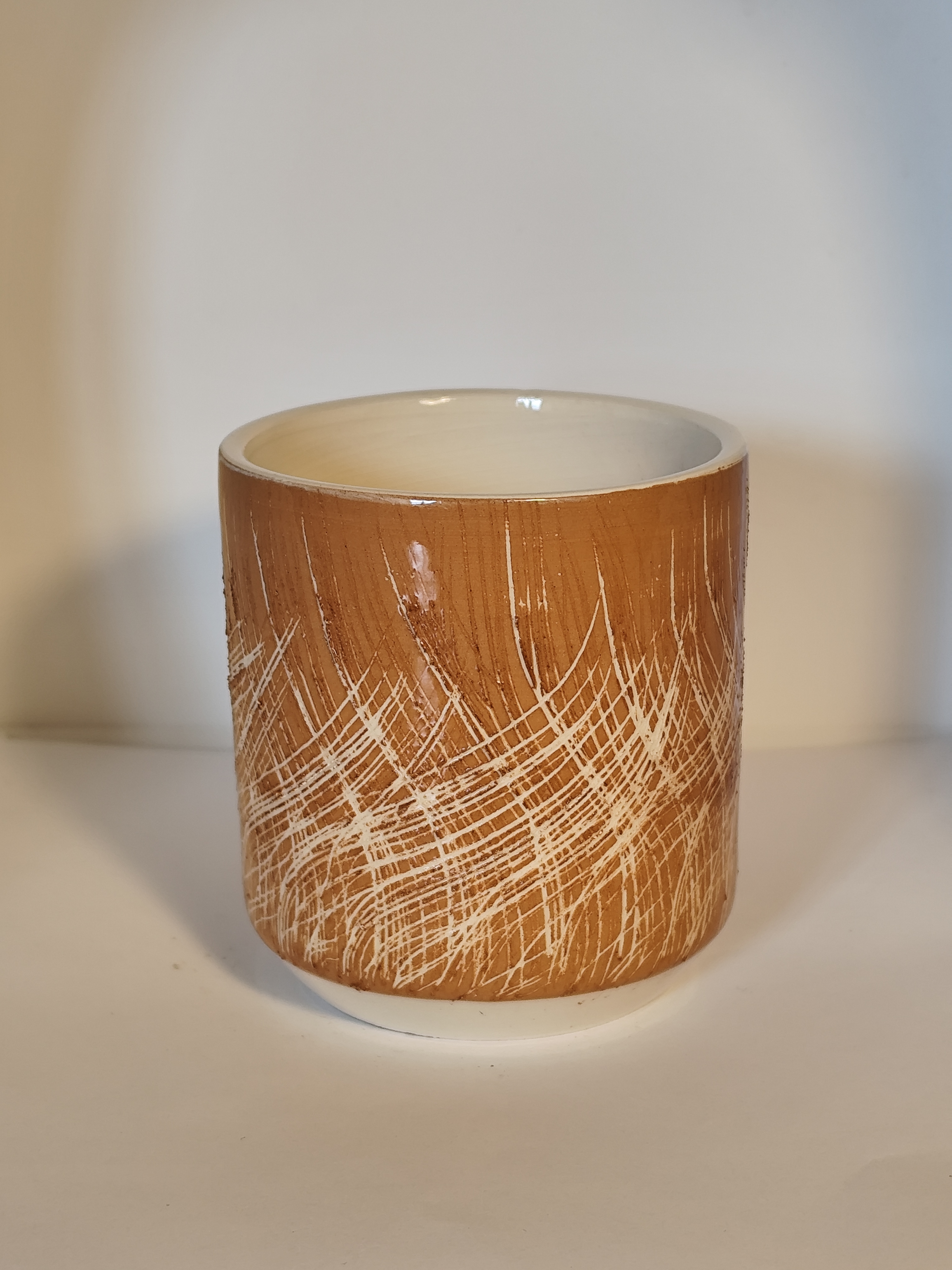 Bicchiere con segni incisi, terra bianca smaltata, engobbio. h 9 cm